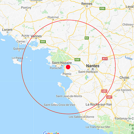 Nous sommes situé sur la commune de CORSEPT entre Pornic et St Nazaire. Le cercle rouge correspond à notre zone fréquente de travail, cependant il est possible d'aller au delà. Ainsi certains clients nous ont par exemple mené à Lorient, Le Mans, Cholet ou encore Genève !
